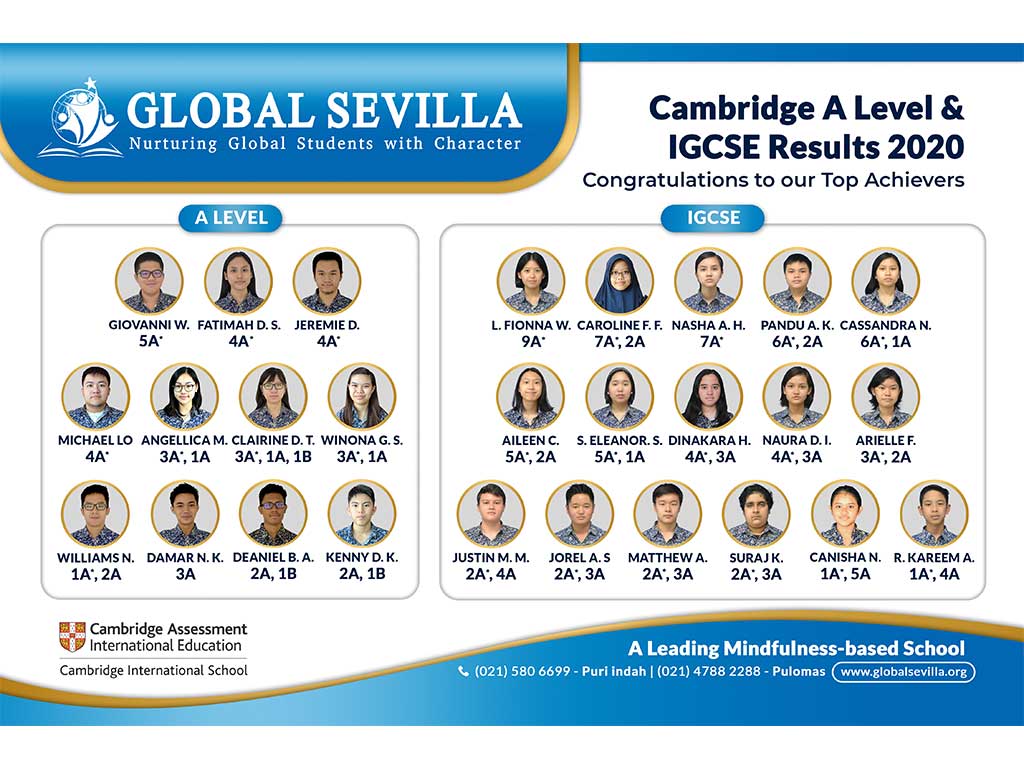 Global Sevilla juga mendapatkan penghargaan secara berturut-turut di tahun 2016 dan 2017 mendapatkan penghargaan dari Cambridge IGCSE, sedangkan di tahun 2018 dan juga di tahun 2019 mendapatkan penghargaan dari Cambridge AS Level & IGCSE.